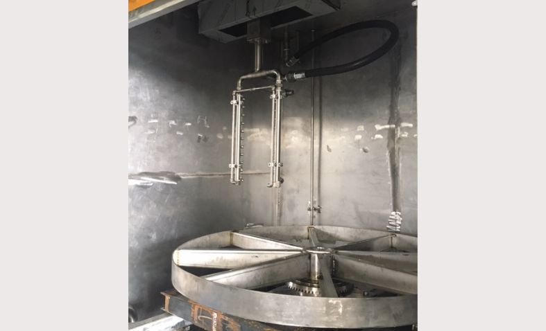 Impianti di lavaggio posizionato a spruzzo con tavola rotante per la pulizia e sbavatura di pezzi meccanici. Bassa produzione per pezzi medi/grandi