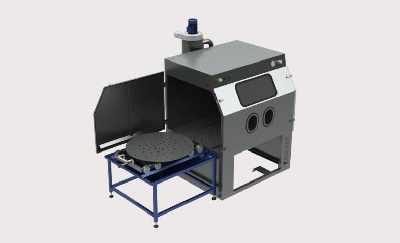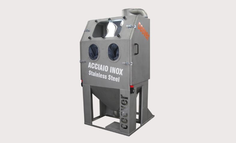 La parte frontale della cabina è progettata per il massimo comfort dell’operatore, con un posto di lavoro ergonomico e una porta di accesso che facilita l’inserimento e l’estrazione dei pezzi da sabbiare.