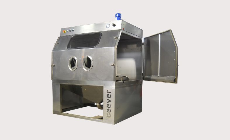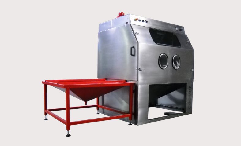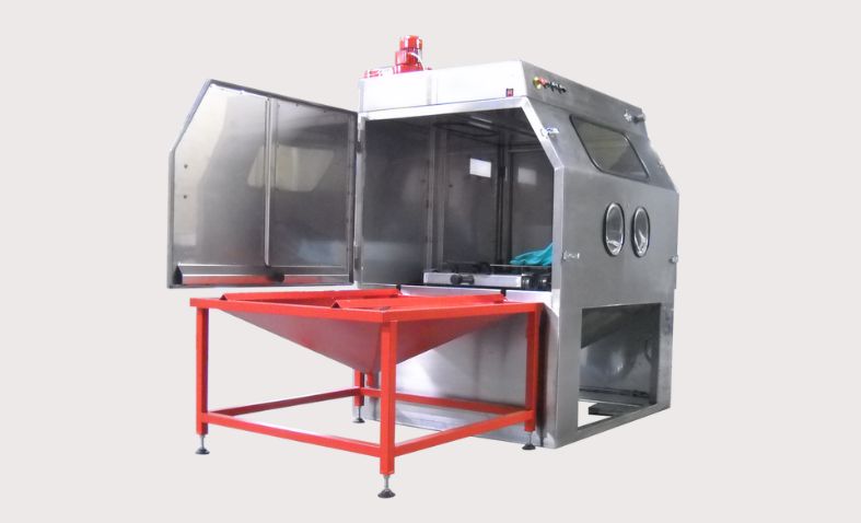 Cabina sigillata e ben illuminata che garantisce precisione e qualità nel processo di sabbiatura.